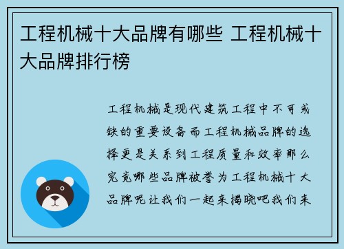 工程机械是现代建筑工程中不可或缺的重要设备,而工程机械品牌的选择更是关系到工程质量和效率。那么,究竟哪些品牌被誉为工程机械十大品牌呢?让我们一起来揭晓吧!