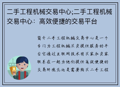 二手工程机械交易中心;二手工程机械交易中心:高效便捷的交易平台