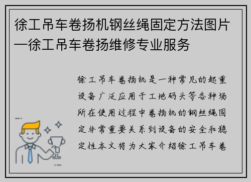 徐工吊车卷扬机是一种常见的起重设备,广泛应用于工地、码头等各种场所。在使用过程中,卷扬机的钢丝绳固定非常重要,关系到设备的安全和稳定性。本文将为大家介绍徐工吊车卷扬机钢丝绳固定的方法,并附上相关图片,希望对大家有所帮助。